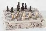 Decorative chess set includes scrimshaw-style design with a seafaring