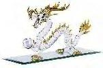 dragon with red, crystal eyes, sits on a rectangular,